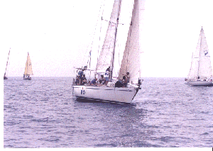 下絵99年湘南で行われたウッディーレースの風上マーク回航時